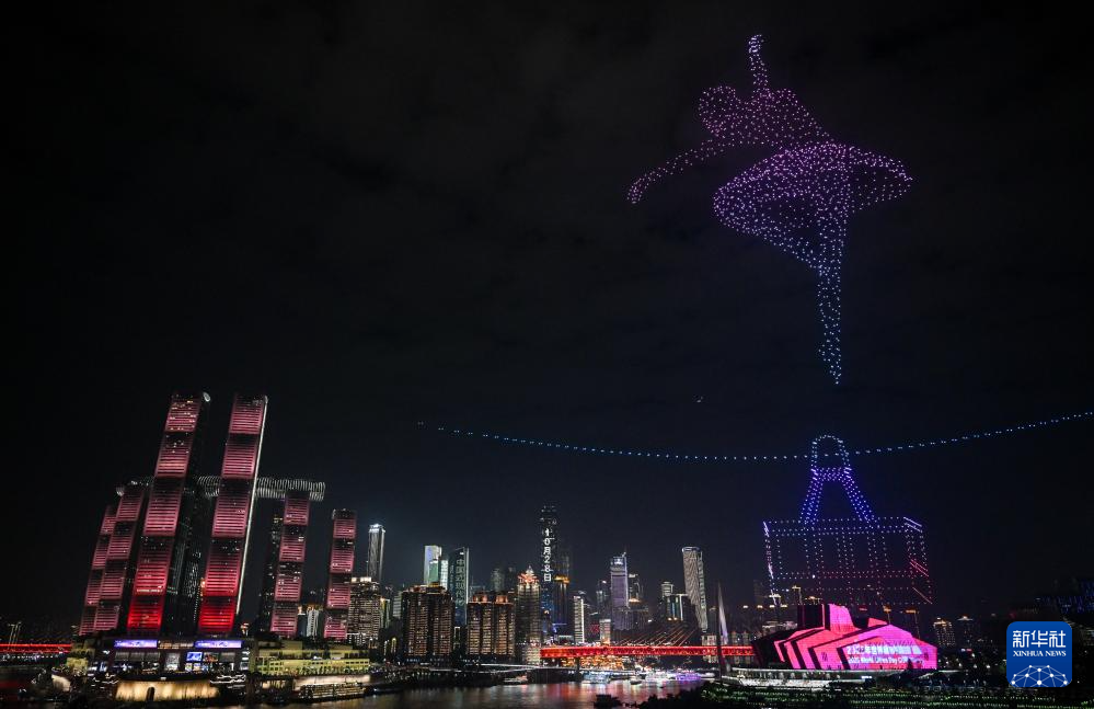 这是10月27日晚在重庆市南岸区南滨路拍摄的一场特别的世界城市日无人机灯光秀。10月27日晚,无人机灯光秀“新韵律重庆”举行了世界城市日专场演出。以“人民城市,智绘未来”为主题,数千架无人机为重庆夜空描绘出一幅智慧与温暖交织的城市景观。新华社记者陈晨供图。